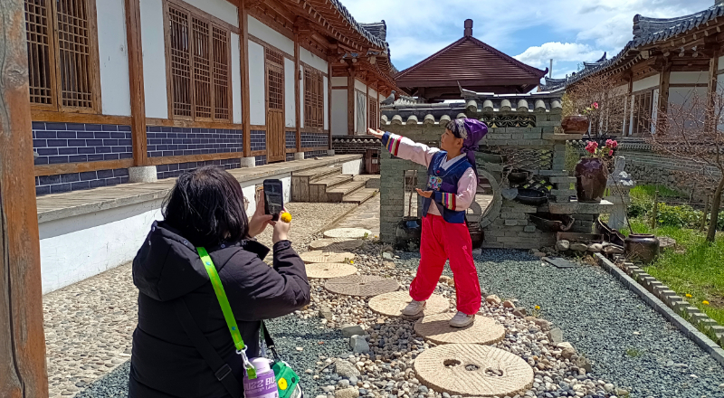 行至防川村,青瓦白墙、古韵十足的朝鲜族传统建筑与雕塑相得益彰,一条条干净整洁的水泥路直通农家。“今天是第一次来珲春,还有好多新鲜的美食,刚和妈妈拍完照回来,感觉特别开心。”身着少数民族服装的北京游客王意嘉兴奋地说。