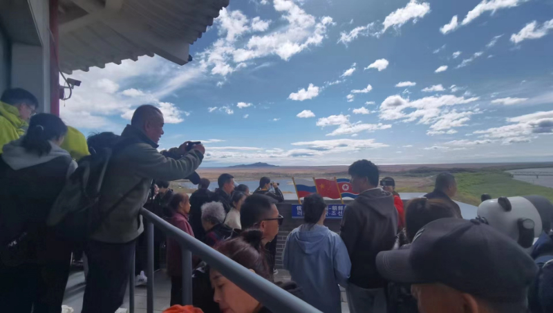 登上饱览边境美景的最佳观赏区——龙虎阁,放眼远望,中朝俄三国景象尽收眼底。游客们一边观赏盛景,一边回顾历史,感受自然静谧的生态之美。延吉游客李怡憬说:“听说防川一眼望三国,最近有时间,我们一家人都过来逛一逛,我刚刚也去看了土字碑,回顾了一下历史,挺有意义的。”松原游客刘时林第一次来珲春,提起对珲春的第一印象,他说,“市容环境也非常整洁,景观也非常漂亮,山高林密的,风景非常好,总体感觉是都非常非常好的。”