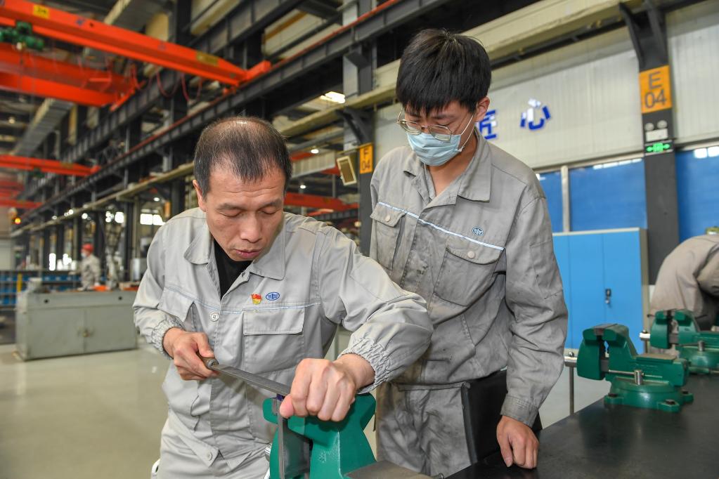 李凯军(左)向年轻工人传授技艺。新华社记者 张楠 摄