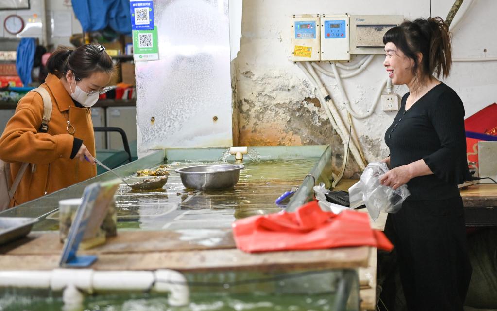 张凤华(右)向顾客介绍海鲜产品。新华社记者 颜麟蕴 摄