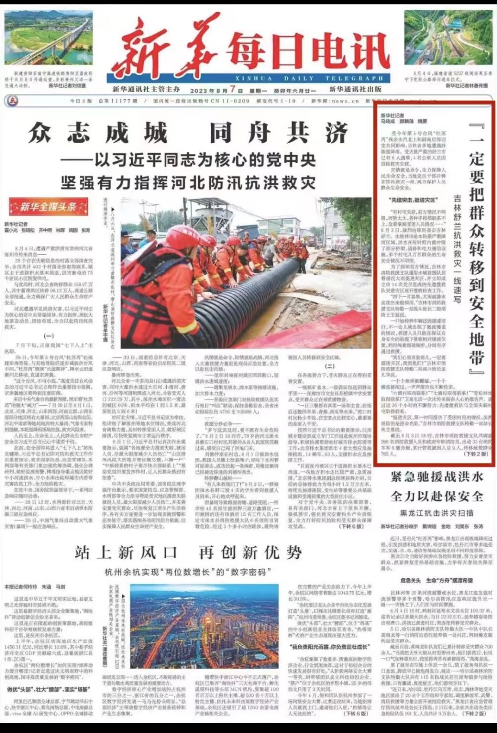 5日14时许,金马镇久胜村出现险情,部分受灾村民因要照看家畜,固执留守,不肯撤离。吉林市公安局特警支队组织突击队员挨家挨户劝导说服,最终于17时40分许成功将受灾村民50余人护送至临时安置点。