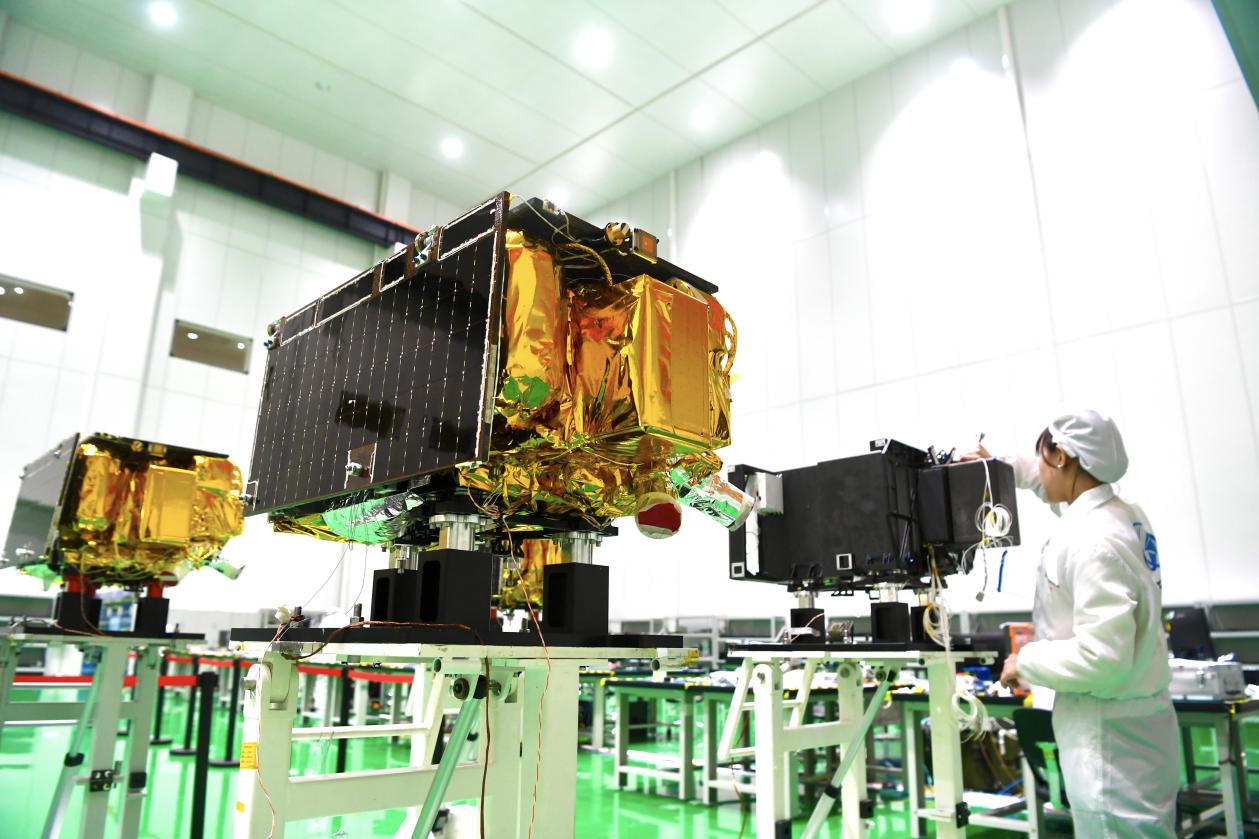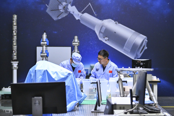 中国科学院空间光学系统在轨制造与集成重点实验室副主任徐振邦(右)与同事在实验室内进行科研工作(5月25日摄)。新华社记者 许畅 摄