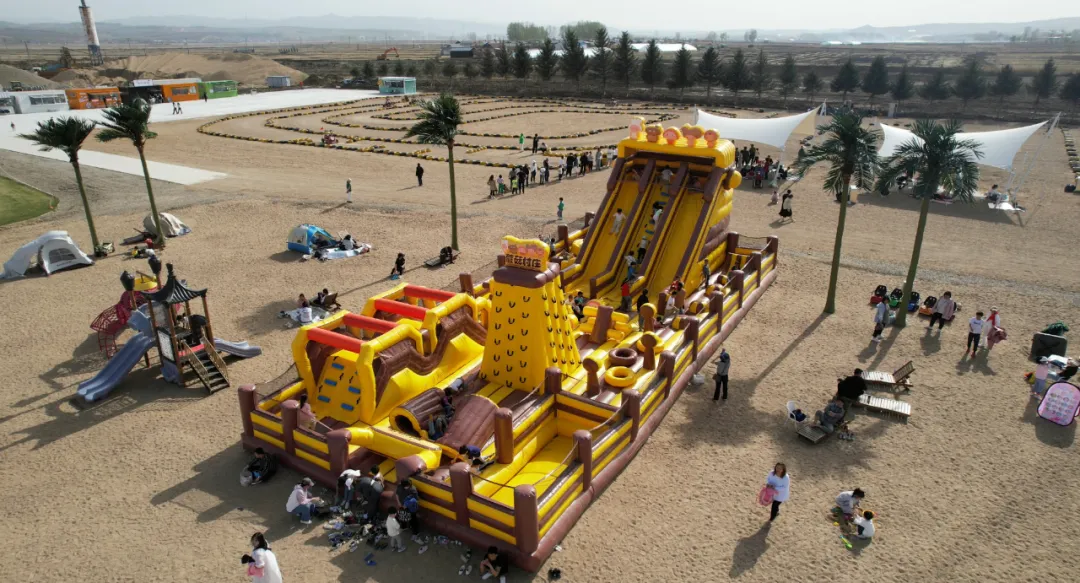 位于东盛涌镇平安村的蘑菇村庄在景区内打造了集打卡拍照、避暑纳凉、亲水娱乐于一体的内陆城市稀缺的沙滩景观,配备沙滩椅、椰子树等沙滩风格造景设施,结合景区内的充气城堡、沙滩全地形车、脚蹬小游船等免费游乐项目,成为众多家庭开展亲子露营的热门选项。游客迟晶函说:“我们来这里玩儿得很开心,这里有水、椰子、沙滩、躺椅,风景美丽独特,娱乐项目也很丰富。”