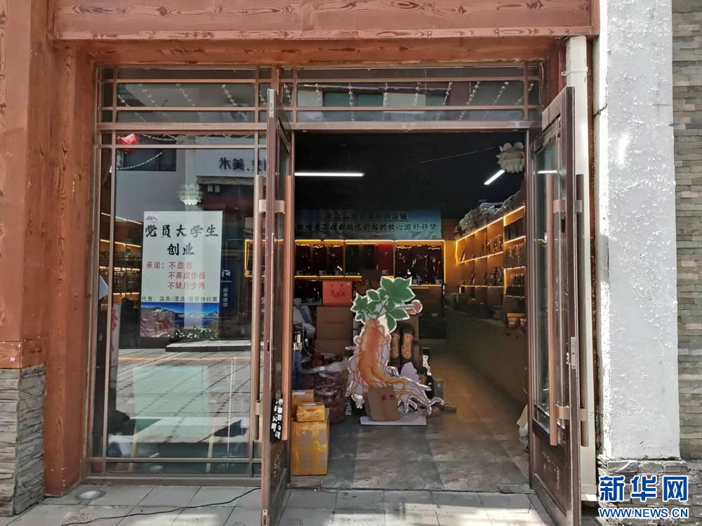步行街分南北两段,以白牛槭路相隔,步入北区,一家小店引人注意,店铺的玻璃窗内贴着一张海报,上面写着“党员大学生创业,承诺:不忽悠,不弄虚作假,不缺斤少两”。