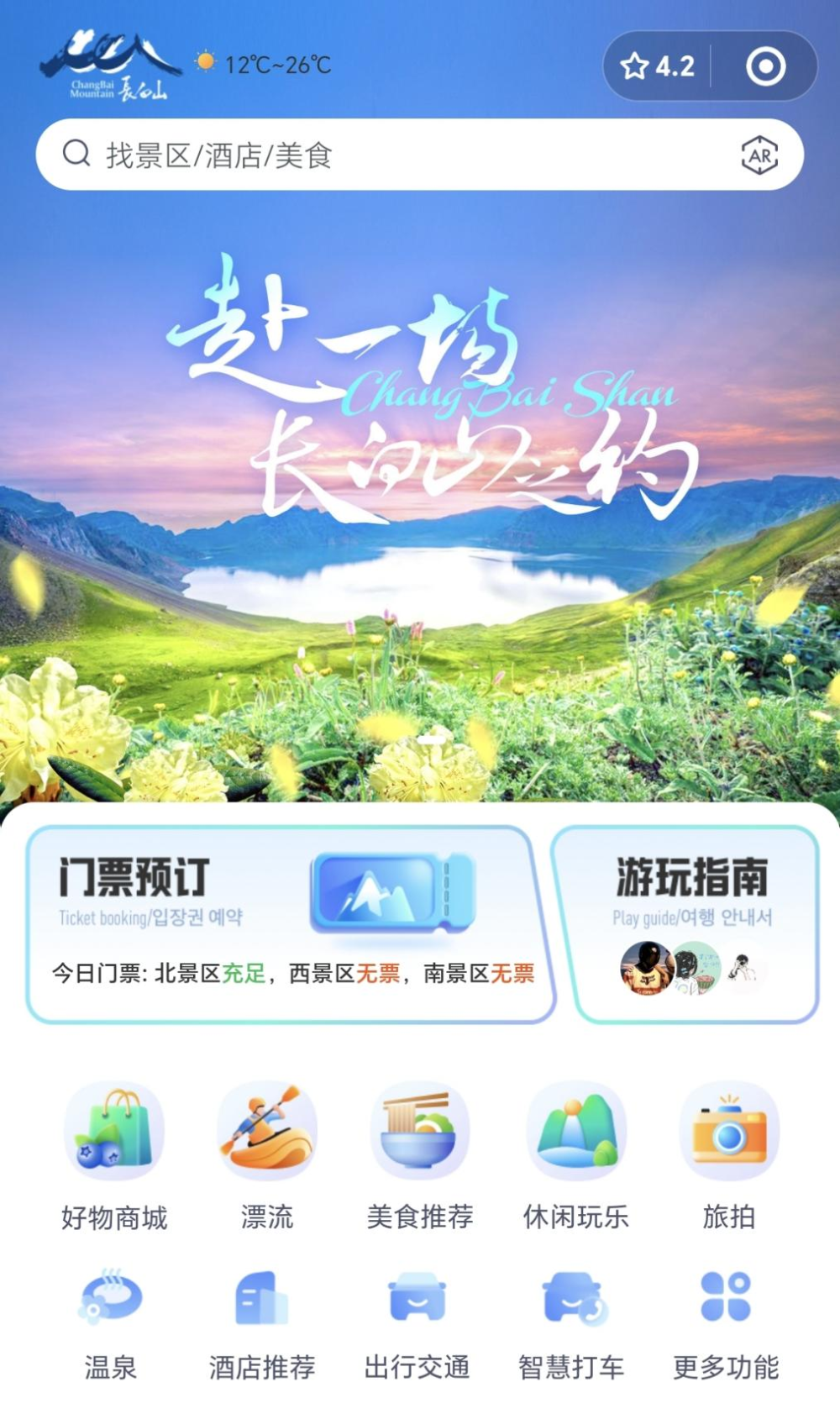 据了解,“长白山一机游”智慧平台由长白山一机游数字科技有限公司携手同程旅行、吉旅控股共同建设,在2023年12月26日正式上线,平台上整合了当地优质的食、住、行、游、购、娱等资源。在微信小程序打开“长白山一机游”,就能看到门票预订、美食推荐、休闲娱乐、酒店推荐、智慧打车、旅拍服务等功能。