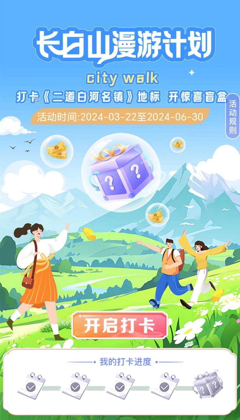 在平台上,还有长白山热门景点的推荐服务,图文并茂,为了丰富旅行的玩法和趣味性,“长白山一机游”还推出了Citywalk打卡抽盲盒、AR寻宝等多种玩法,参与活动就有机会赢得奖品。