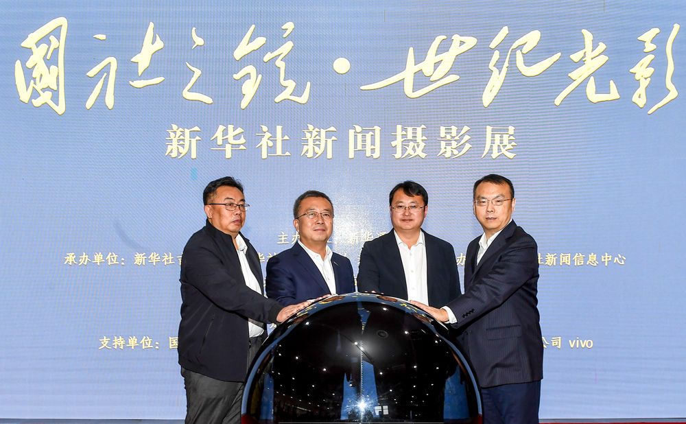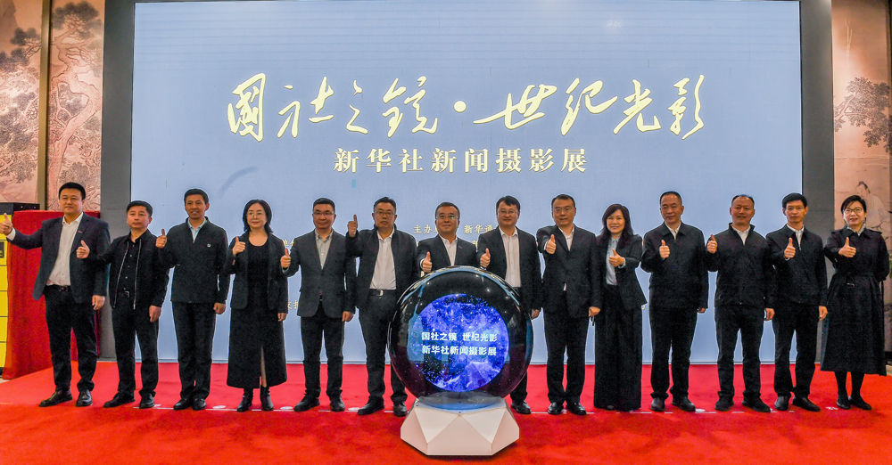 9月30日,在“国社之镜·世纪光影”新华社新闻摄影展吉林分展开展仪式现场,嘉宾共同触摸启动球。