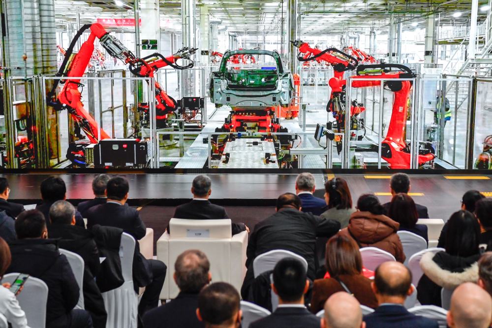 2024年1月26日,奥迪一汽新能源汽车有限公司预批量生产正式启动,嘉宾观看奥迪一汽新能源汽车有限公司生产车间的宣传短片。 新华社记者 许畅 摄