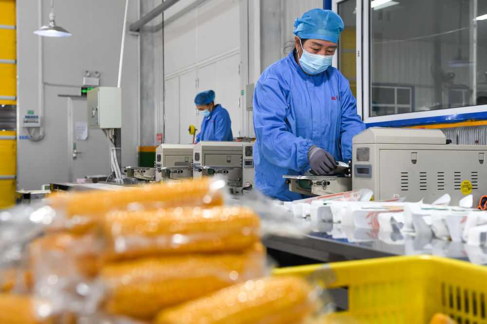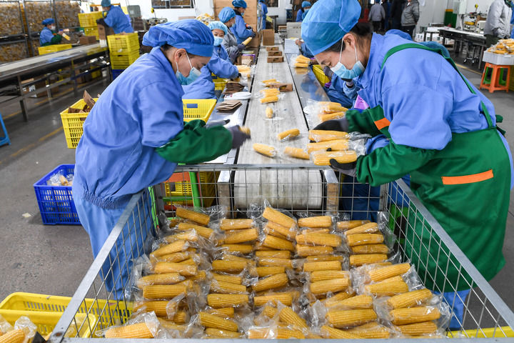 2024年1月25日,在位于吉林省公主岭市的吉林德乐农业开发有限公司,工人包装鲜食玉米。新华社记者 张楠 摄