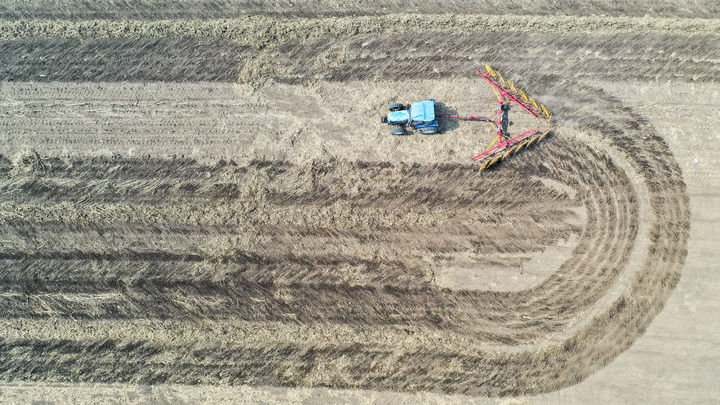 2024年4月2日,农民在吉林省公主岭市范家屯镇驾驶农机整理耕地里的秸秆(无人机照片)。新华社记者 张楠 摄