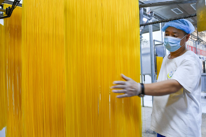 2024年1月25日,在公主岭市健亿农业综合开发有限责任公司,工人查看玉米面条生产情况。新华社记者 张楠 摄