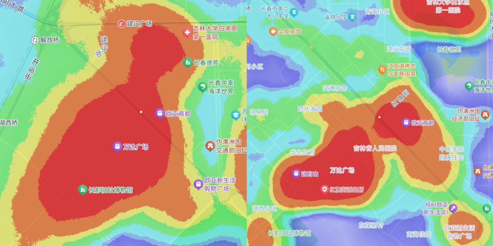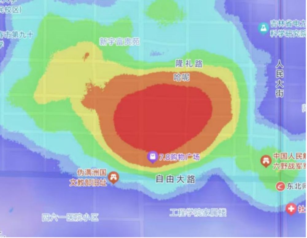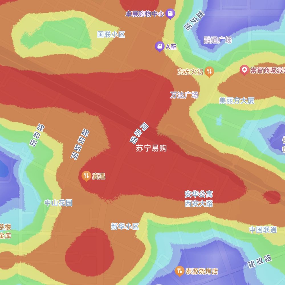 热力图通过颜色的变化,展示所选区域人群密度与活动强度。通过观察区域热力指数,便可以让我们对城市的人口分布及流动情况有较为清晰的认知,也是衡量城市活力的重要标尺。