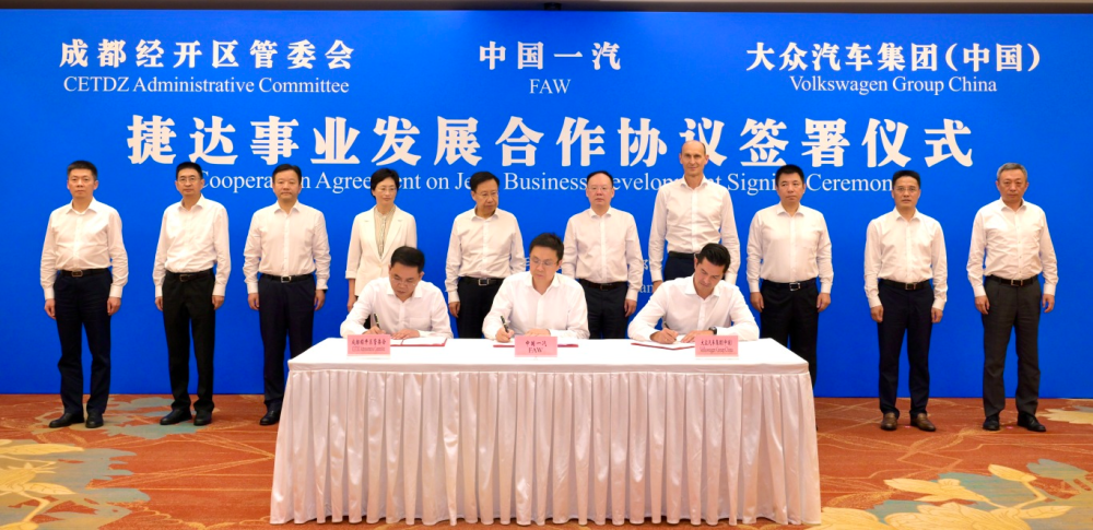▲中国一汽、大众汽车集团(中国)、成都经开区管委会在成都签署《捷达事业发展合作协议》