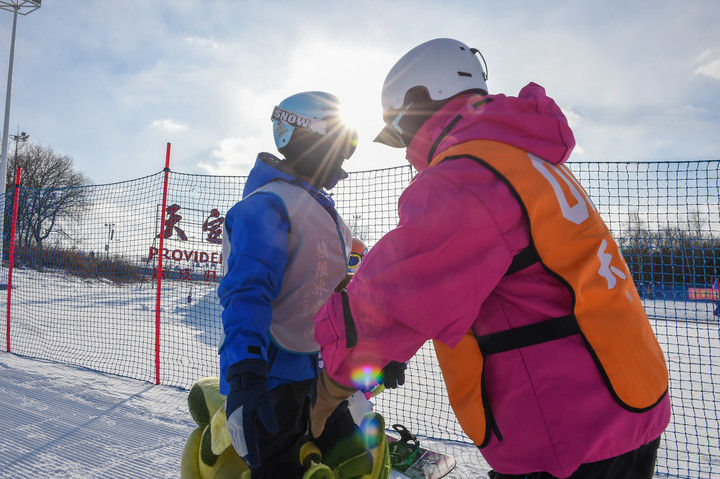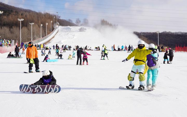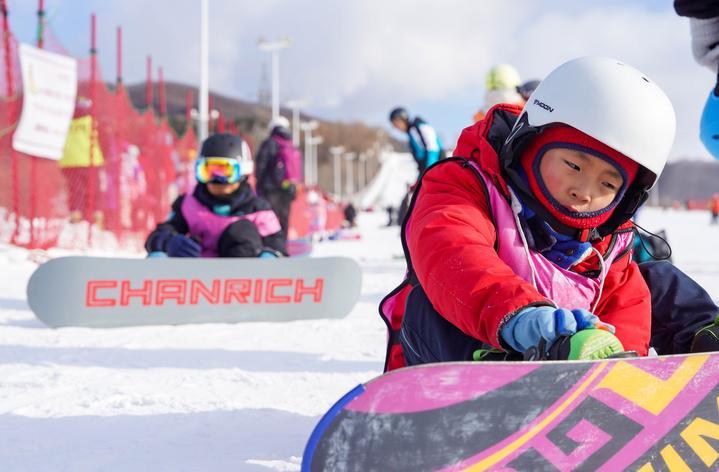 12月3日,吉林市中小学生在吉林市纳美山谷度假区体验单板滑雪。