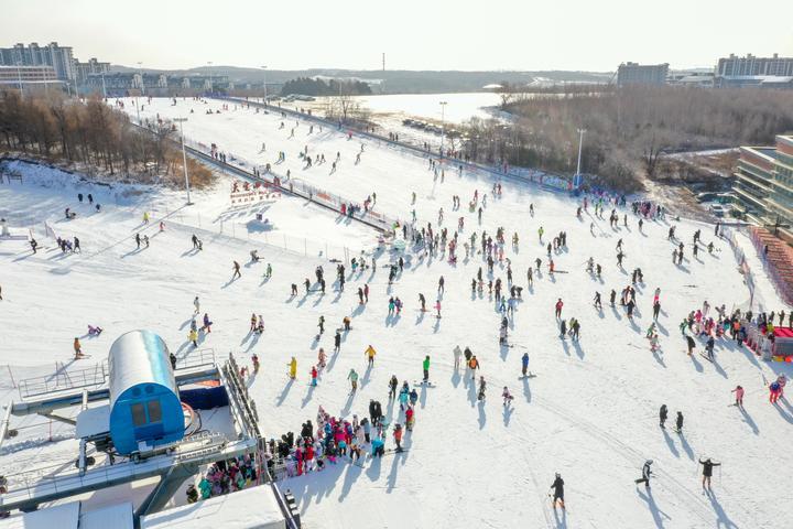 12月3日,众多学生、家长和滑雪爱好者在长春市天定山滑雪场滑雪(无人机照片)。