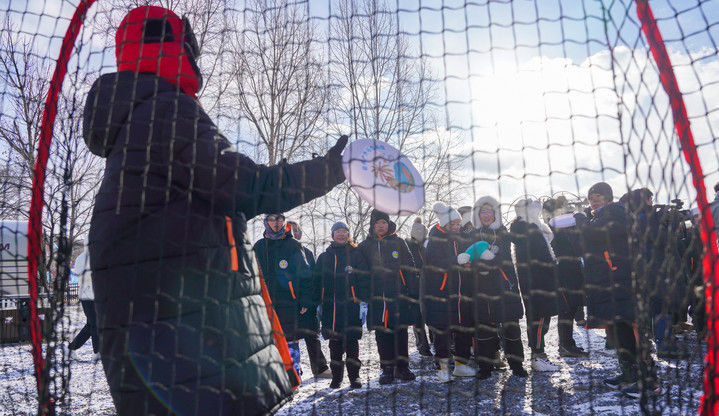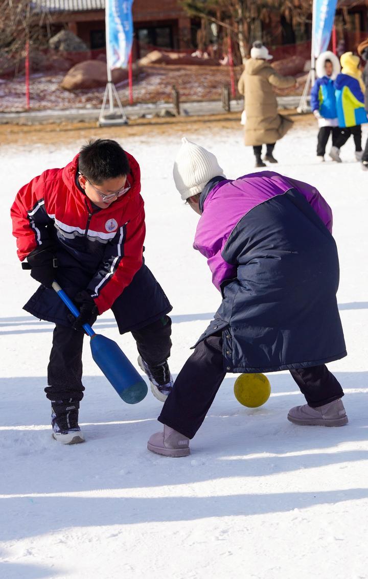 12月3日,吉林市第二实验小学学生在吉林市纳美山谷度假区体验雪上软式棒球。