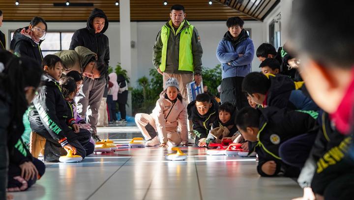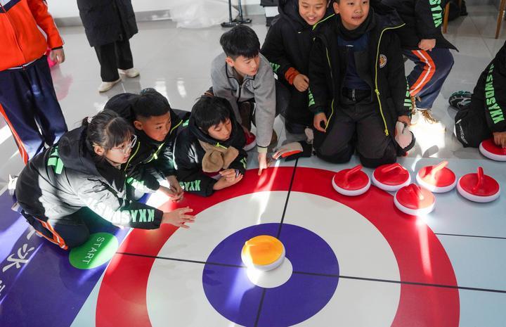 12月3日,吉林市松江东路小学校学生在吉林市纳美山谷度假区体验旱地冰壶。