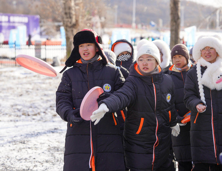 12月3日,吉林市第一实验小学学生在吉林市纳美山谷度假区体验雪地飞盘。