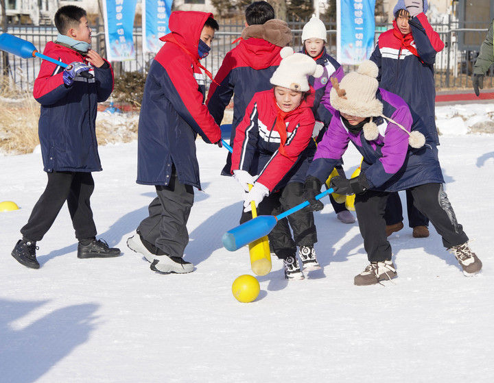12月3日,小学生在吉林市纳美山谷度假区开展趣味冰雪活动。