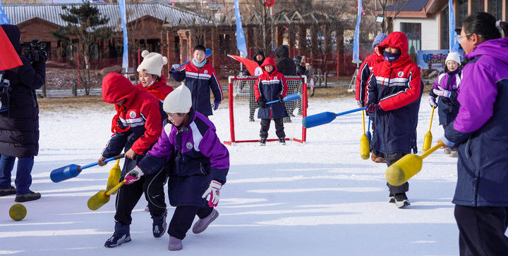 12月3日,吉林市中小学生在吉林市纳美山谷度假区体验雪地龙舟比赛活动。