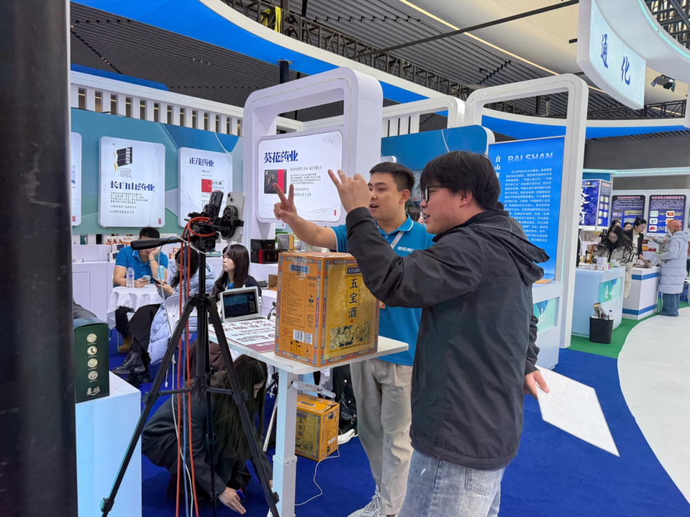 12月8日,长春健博会参展企业在长春现代化都市圈医药产业带展区进行直播推介。新华社记者 赵丹丹 摄