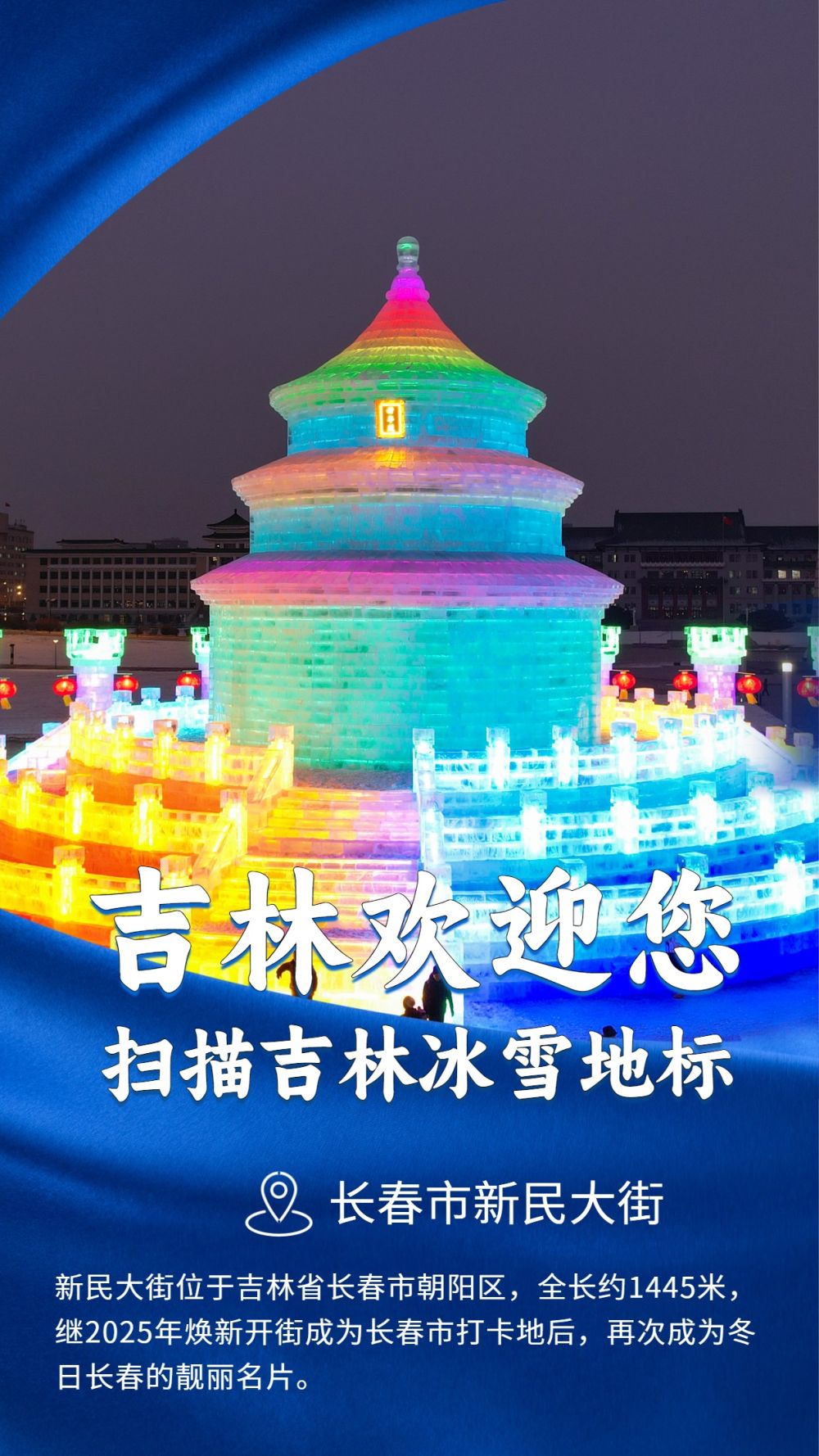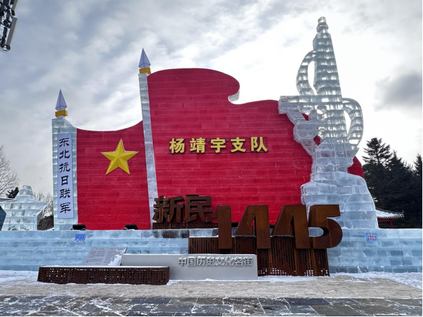 该冰雕位于新民大街与解放大路交汇,通过分层搭建与动态灯光技术,融合东北抗日联军旗帜、杨靖宇支队标识、步枪造型及“新民1445”字样等元素,形成立体且富有张力的艺术形态,打造长春“传承红色基因、展现城市底蕴”的生动名片,助力“冰雪文化+红色文旅”的品牌融合发展。