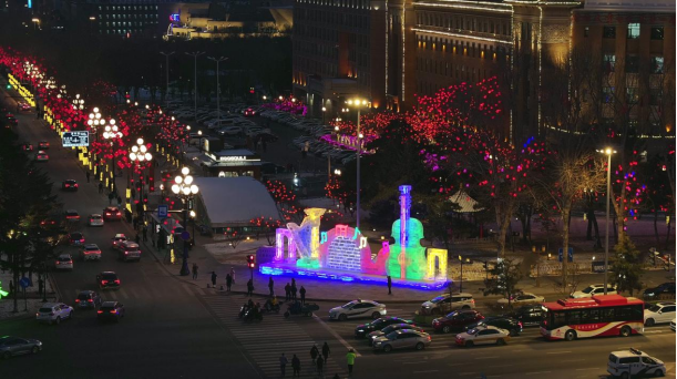 傍晚,走进长春市新民大街,一组组光彩夺目、绚丽缤纷的大型冰雕雪塑亮相街头,吸引众多市民游客拍照打卡,继2025年,焕新开街成为长春市热门打卡地后,新民大街再次成为冬日长春的靓丽名片。