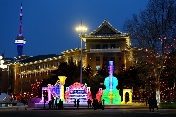 该冰雕位于新民大街与解放大路交叉口,以音乐艺术为核心主题,融合竖琴、吉他、音符、脚踏键盘等元素,通过冰雕工艺打造出立体且富有韵律的艺术形态。