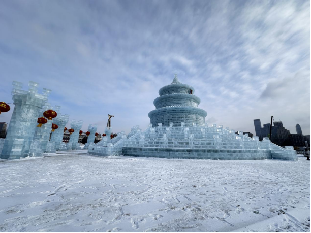 该冰雕位于文化广场,以天坛建筑为核心,配以祈年殿标识,融合长城元素与红灯笼,总高21米的大型冰雕。以“盛世中华”为主题,通过复刻天坛这一中华传统文化地标,传递对国家繁荣昌盛的美好祝愿。