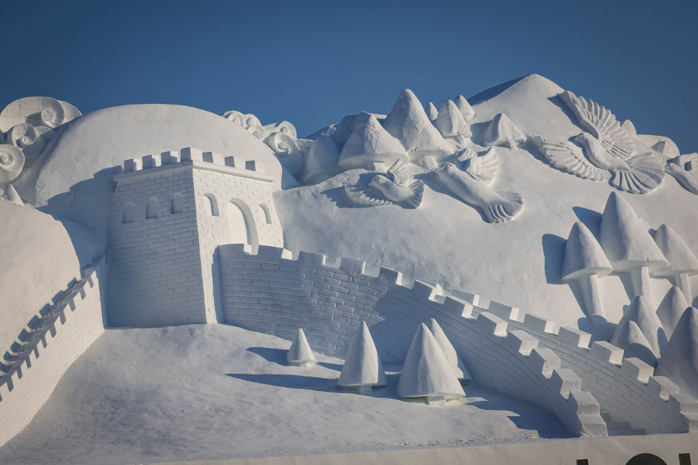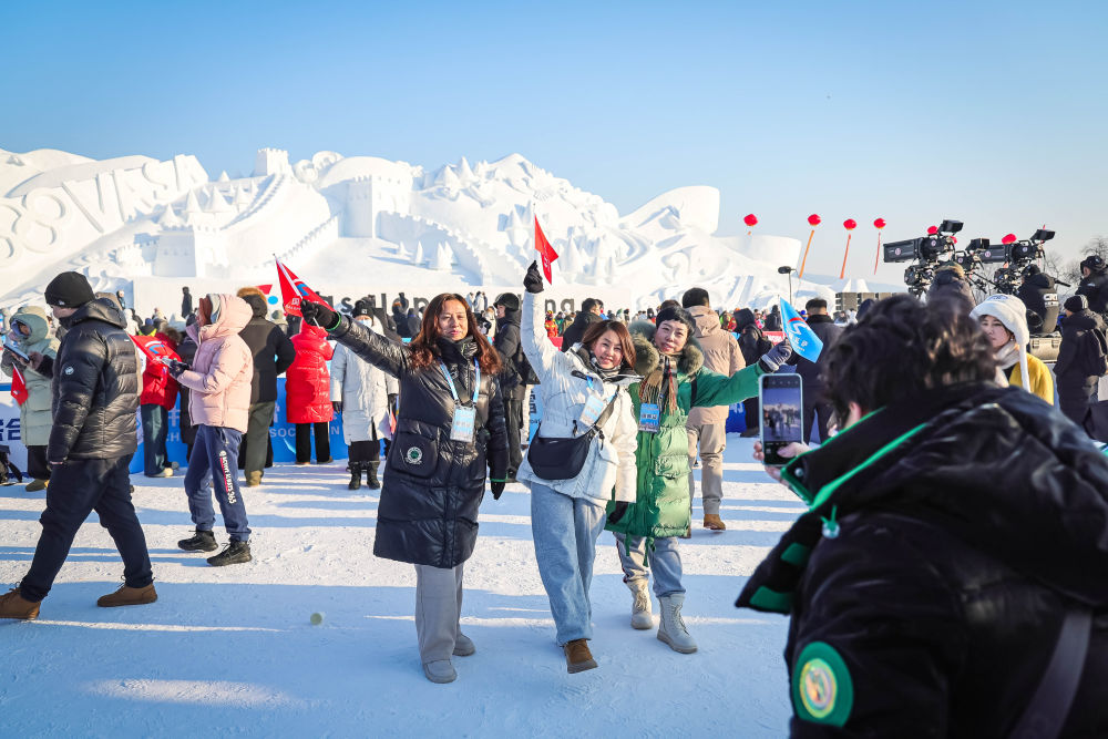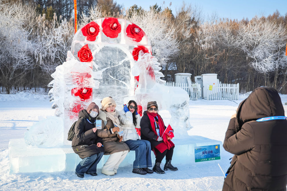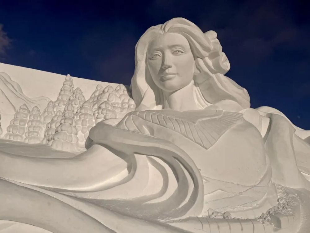 2025-2026新雪季,净月潭雪世界主雪雕以《雪韵华章·瓦萨二十四载》为主题,设立“画镜女神”“长空逐梦”等7座大型雪雕,以及“蓝冰钻石爱情海”“一路生花”冰花墙、“柿柿如意”等28组冰雕景观。