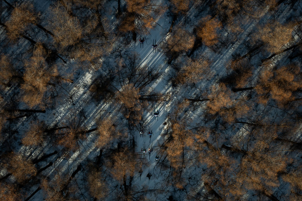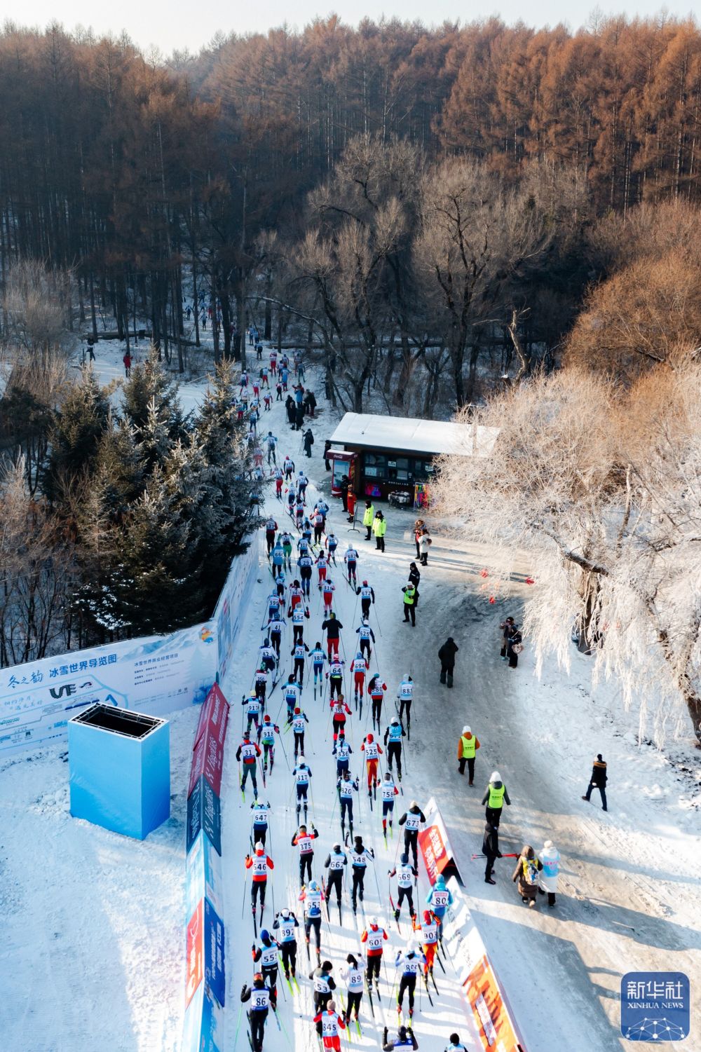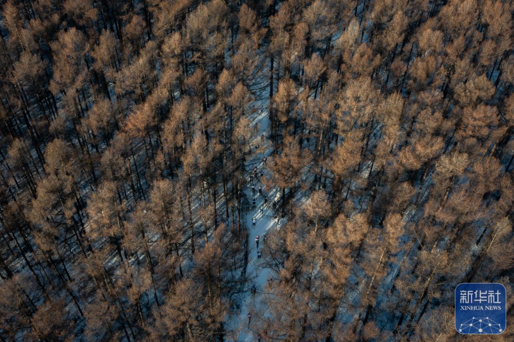 1月4日,第24届中国长春净月潭瓦萨国际滑雪节在长春市净月潭国家森林公园启幕,参赛选手在比赛中(无人机照片)。新华社记者 许畅 摄