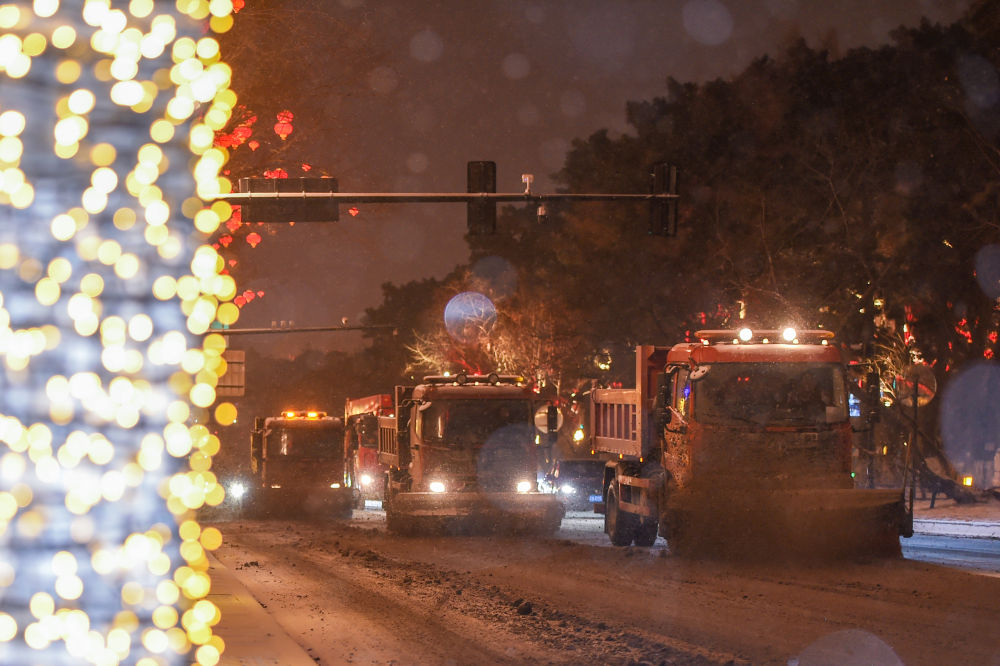夜渐渐深了,路灯下,雪还在不停下着,一台台清雪作业车仍在路上奔忙,轰鸣的发动机声响彻整个夜空。
