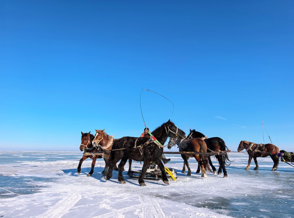 经过几小时等待,临近中午,是时候收网了。这个环节由人和马共同完成,依靠马拉绞盘。由于渔网有几千斤重,渔夫们把五匹骏马系在绞盘上,让马儿们像在磨坊里拉磨石一样围着绞盘奔跑。渐渐地,连接渔网的穿杆被拉了上来,收紧的大网也随之被拉出冰面。
