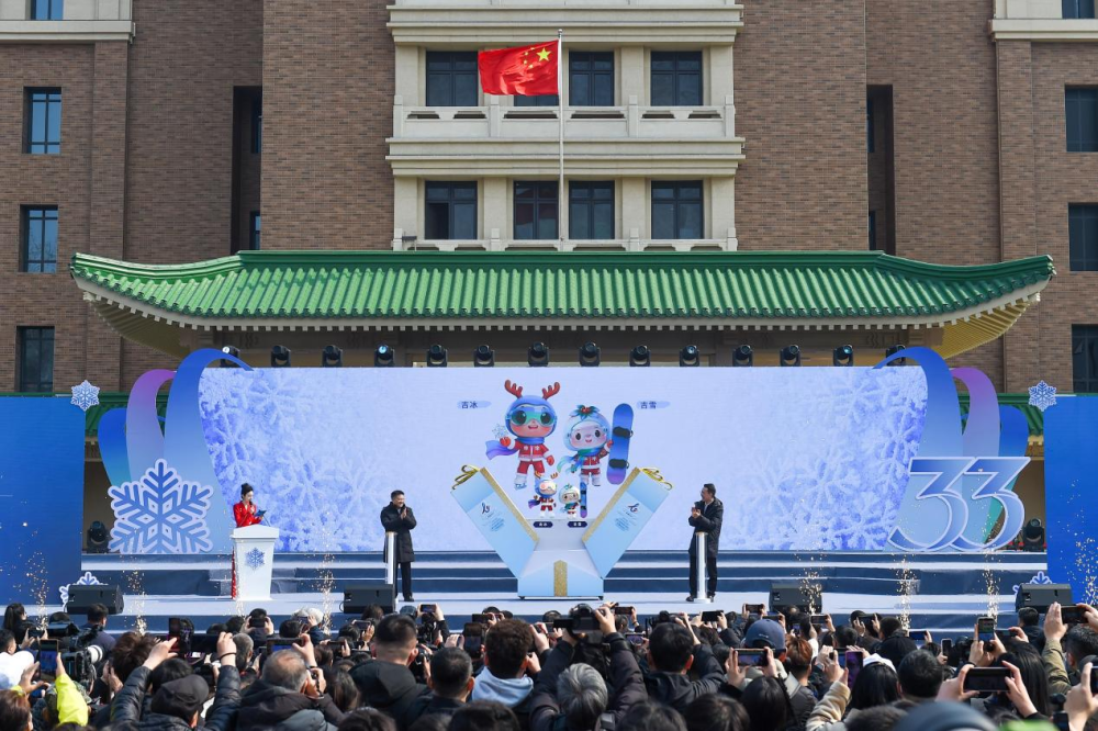 在倒计时活动现场,还开展了丰富多彩的非遗展演、高校快闪、群众体育等百余场活动,上万名市民走上长春新民大街,与“吉冰”“吉雪”合影互动,共同期盼大冬会的到来。